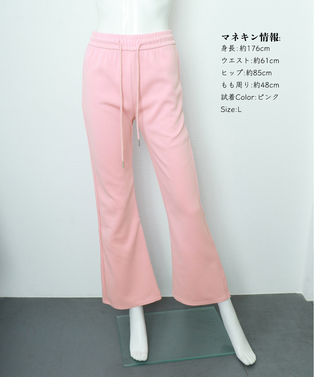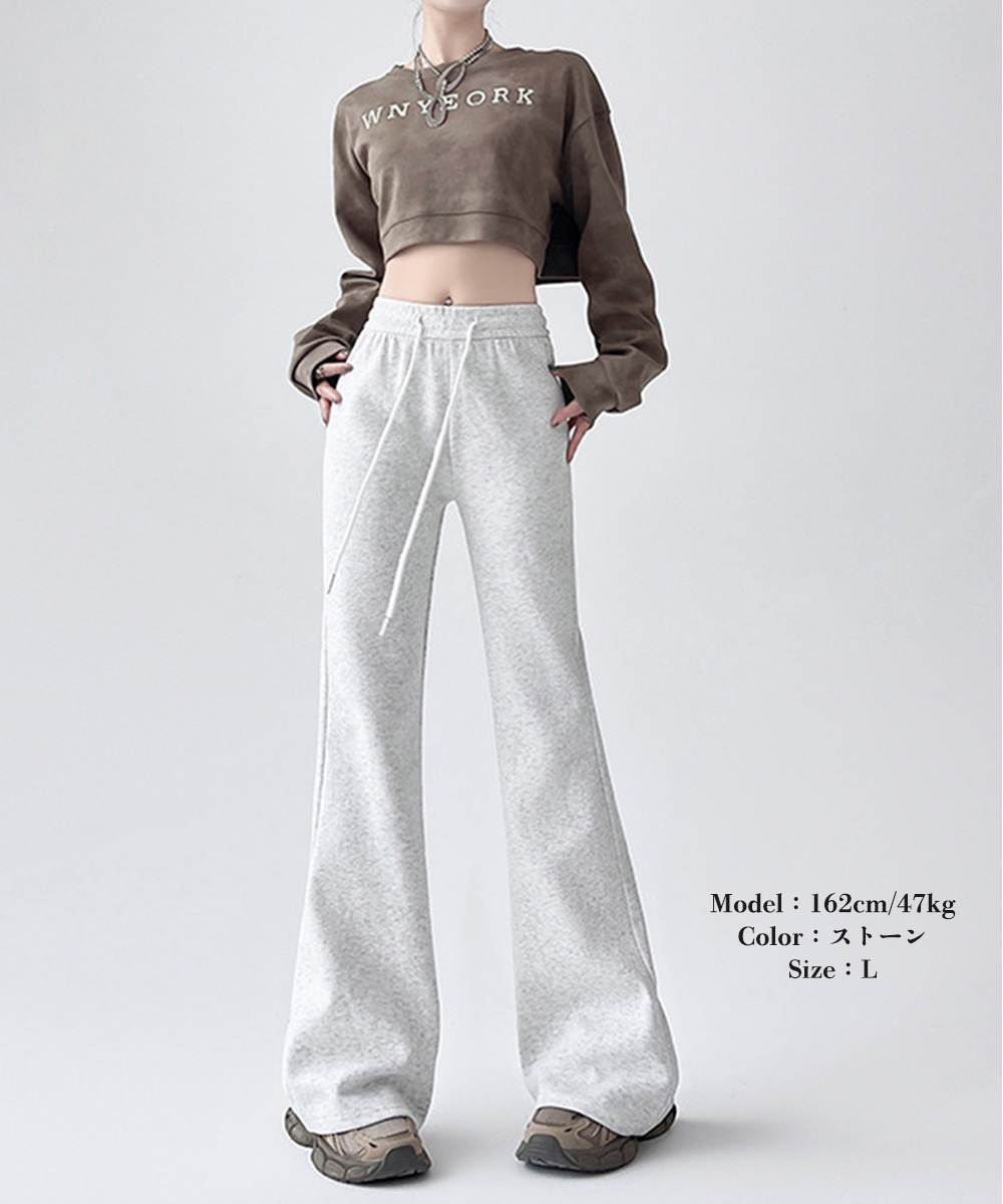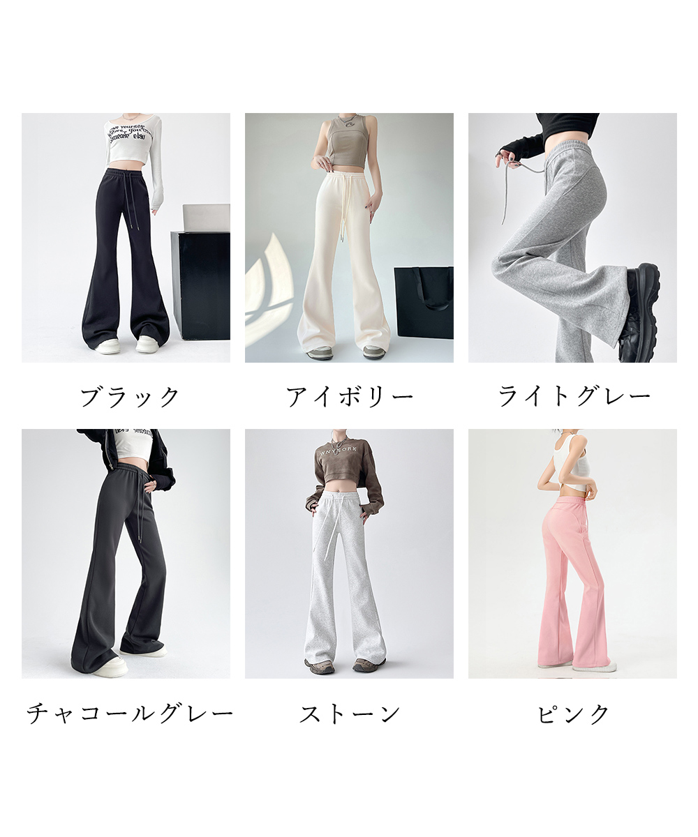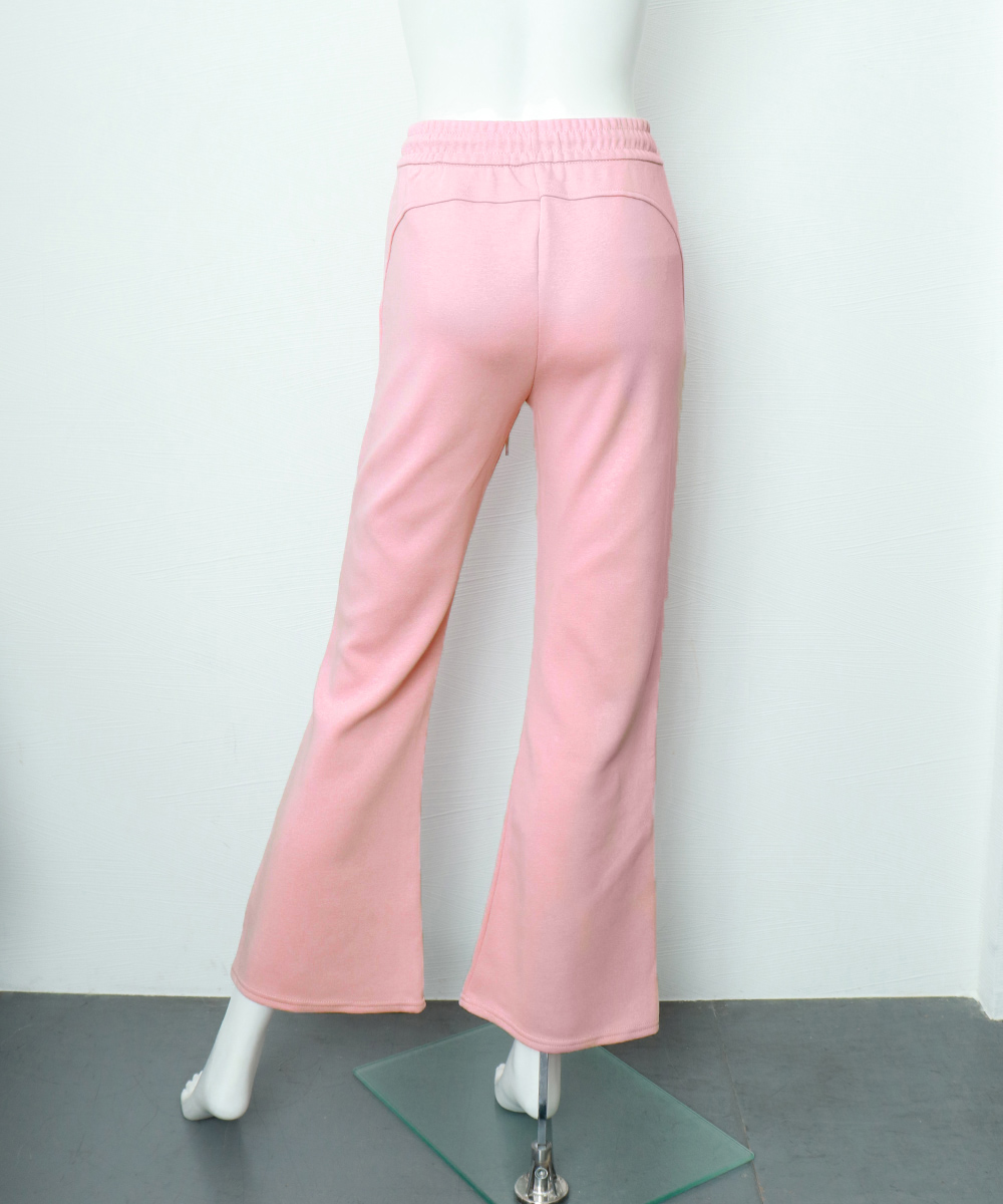 裾に向かって広がるフレアシルエットが美脚ラインを演出するスウェットパンツです。
