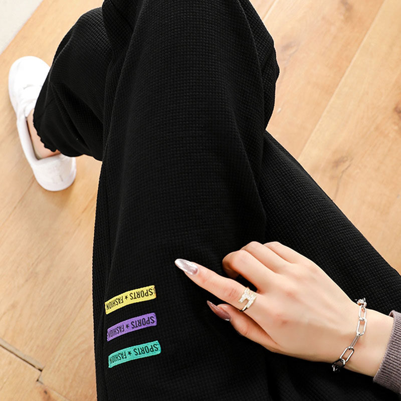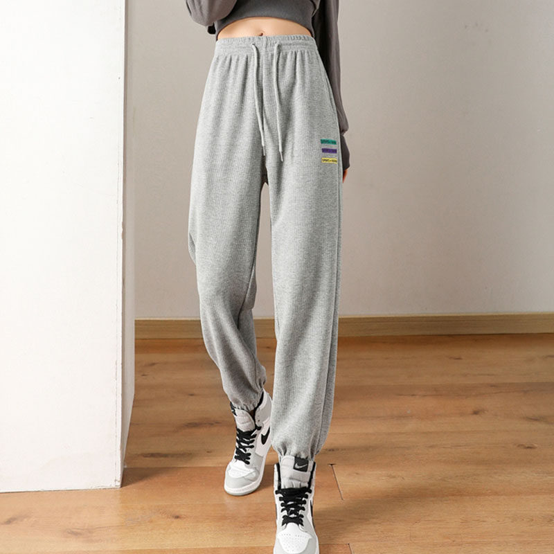 裾はリブ仕様で足首をすっきり見せ、サイドには虹の刺繍がアクセントになっています。