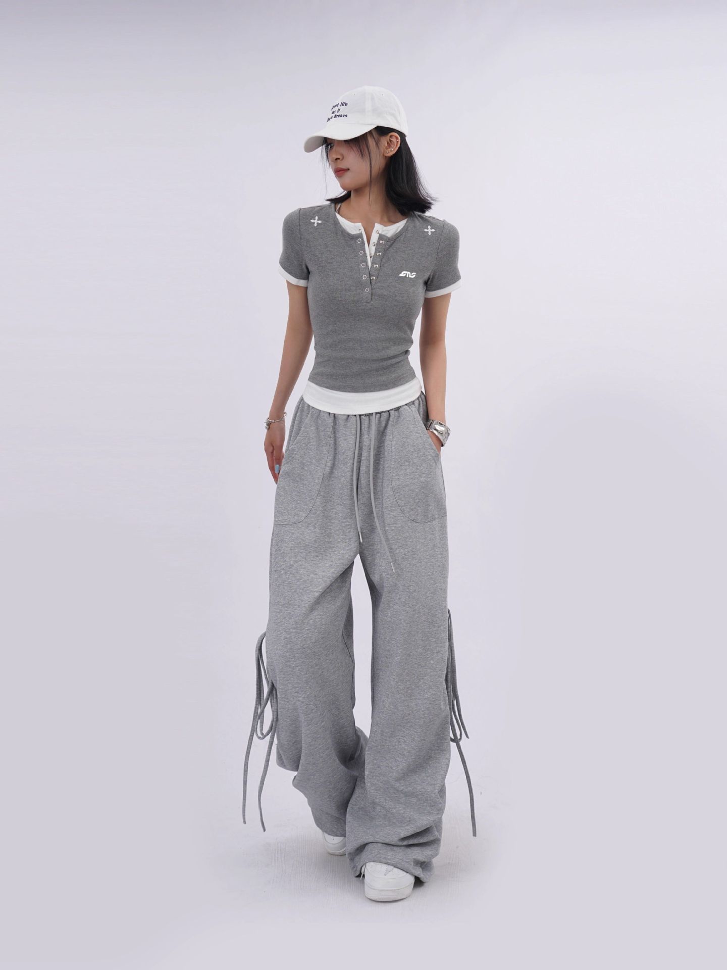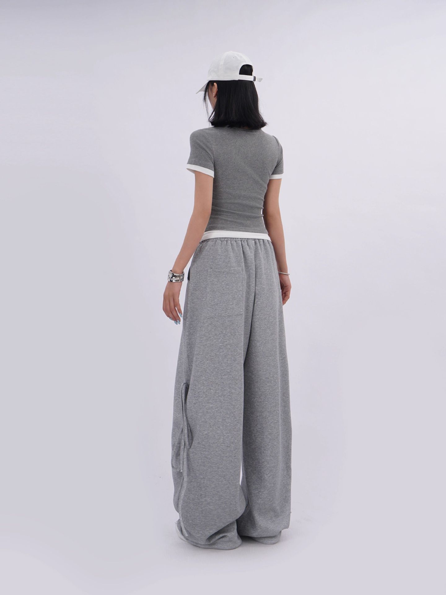 両サイドに配されたリボンディテールと裾のギャザーデザインが特徴的で、カジュアルながらも存在感のあるスタイリングを実現します。