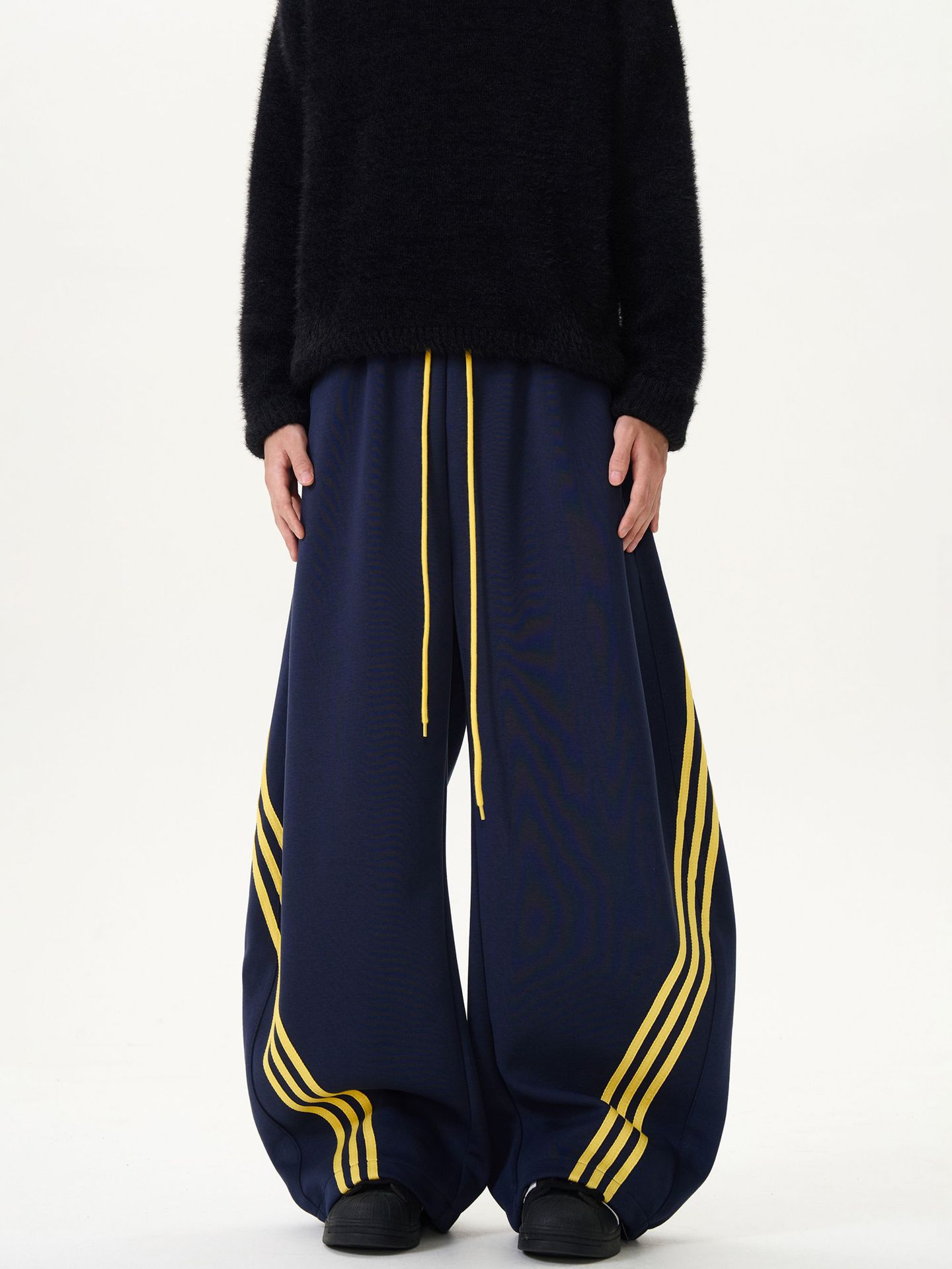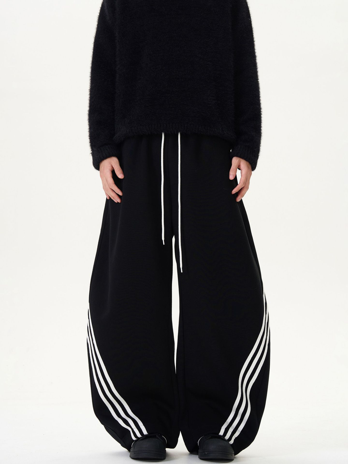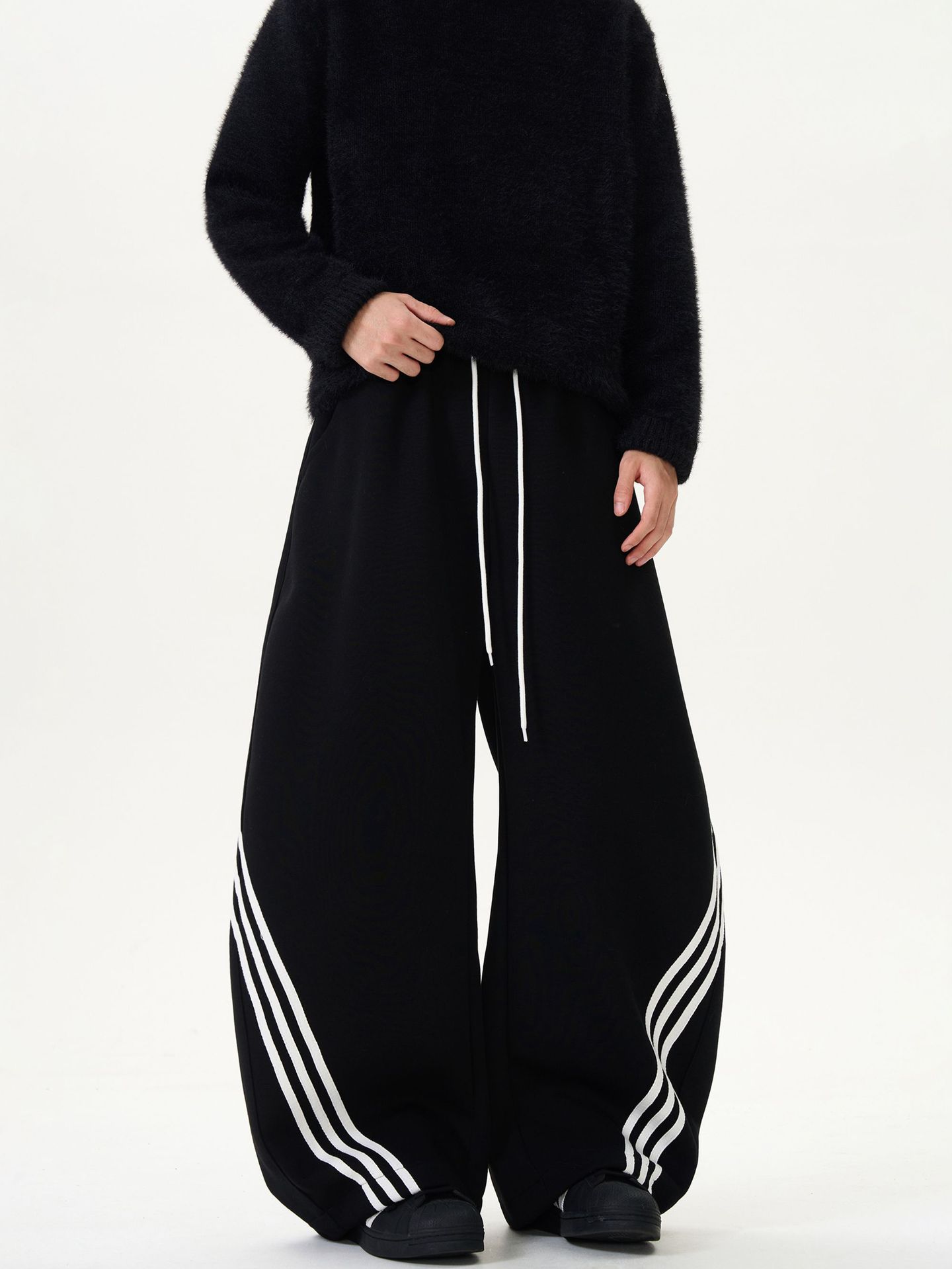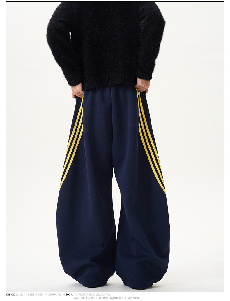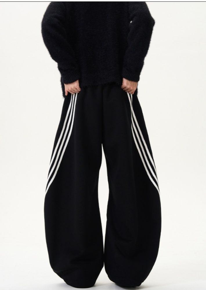 裾に向かって広がるワイドシルエットが特徴的なスウェットパンツです。